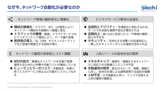 - 人材不足とスキルギャップ: ネットワーク運用には高度な専門知識が求められますが、慢性的な人材不足やスキルギャップが深刻化しており、安定した運用を維持することが困難になっています。