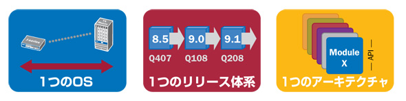 図1: JUNOSのソースコードは常に一つ。一貫性と安定性のあるリリース体系、単一のモジュラー式アーキテクチャにこだわっています。
